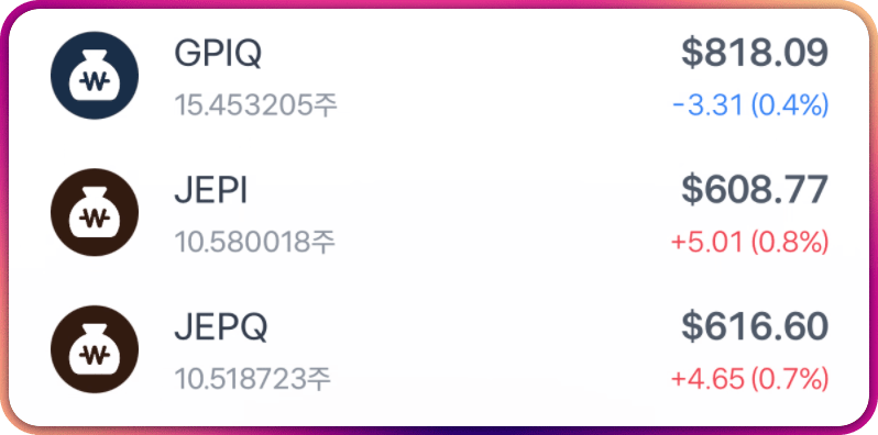 최근에는 빠른 은퇴를 위해 커버드콜 상품도 많이 발전했다고 하는 것 같아서, JEPQ, 또는 GPIQ에 관심을 기울이고 있습니다. 유의미한 배당금을 받으려면 몇억을 넣어두면 되는데, 이거 참... 예전에 소비해버렸던 돈을 모두 여기에 묻어두었으면 지금 어땟을까 하는 생각이 많이 드네요.