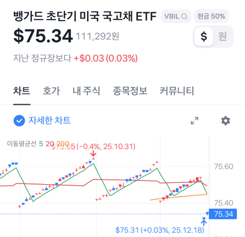 일단 원화가 아니라면 미국의 단기 국채인 SGOV를 사두면 되는 것으로 판단이 됩니다. 뱅가드에서 만든 VBIL도 있는데 이게 조금 더 수수료가 싸기도 해서 VBIL도 더 매집을 해두려고 하구요. 연금저축에서는 TIGER 미국초단기(3개월이하)국채를 모아하면 일단 달러 이자를 받으면서 투자하는 효과가 있으니, 원화 대신 달러 현금 비중을 쌓아두고 싶다면 이게 정답인듯 합니다.